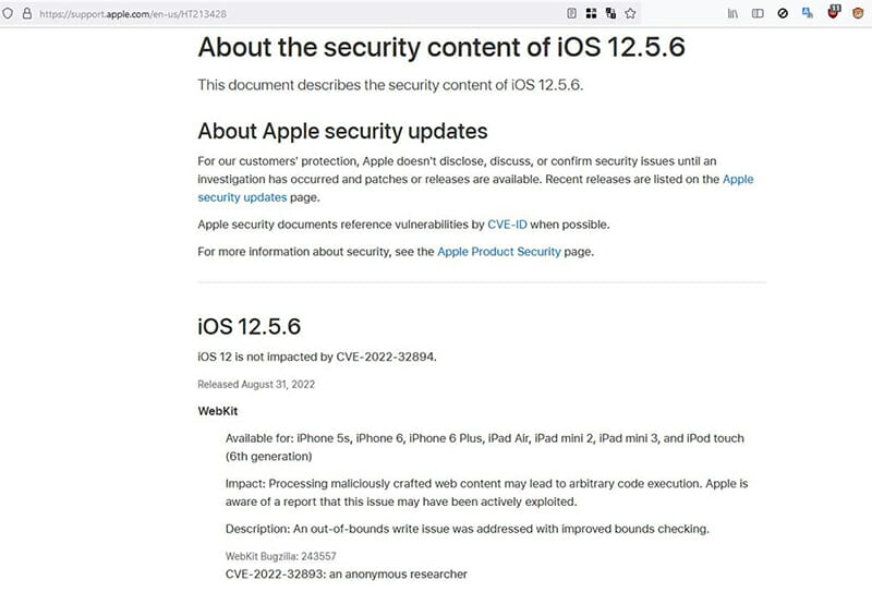 Bản cập nhật iOS 12.5.6 này có khả năng giải quyết hai lỗ hổng bảo mật lớn. Lỗ hổng đầu tiên này có thể cho phép một ứng dụng thực thi mã tùy ý. Lỗ hổng thứ hai là chính trong WebKit, cho phép các website độc hại có thể chạy các đoạn mã không được kiểm tra, nếu như người dùng mở website đó bằng Safari hoặc là một trình duyệt nào đó.