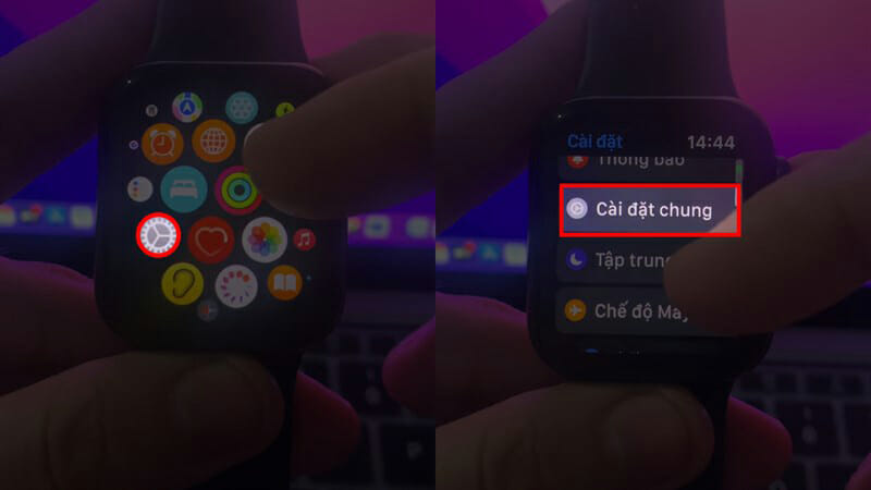 Bước 1: Để chụp ảnh trên chiếc Apple Watch thì người dùng có thể sử dụng bằng cách ấn cùng lúc 2 nút xoay Digital Crown và nút sườn để chụp. Tuy nhiên người dùng bấm nhưng không thể nào chụp được thì hãy vào ngay phần Cài đặt của đồng hồ, ấn tiếp vào phần Cài đặt chung.