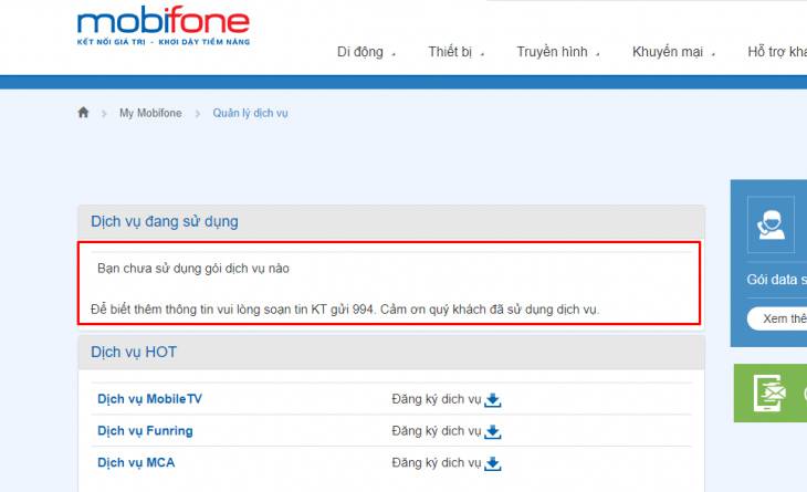 Bước 2: Tại đây, các dịch vụ mà bạn sử dụng sẽ hiển thị trong mục các dịch vụ đang sử dụng. Nếu bạn không đăng ký dịch vụ nào thì kết quả sẽ hiển thị như hình dưới.