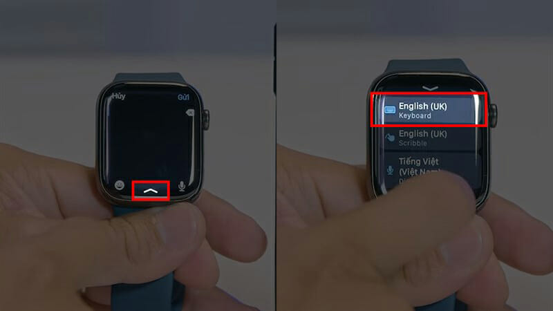 Bước 3: Từ bây giờ khi người dùng muốn trả lời tin nhắn trên Apple Watch bằng cách soạn văn bản thì tại giao diện trả lời tin nhắn sẽ xuất hiện một mũi tên phía dưới màn hình, hãy vuốt màn hình từ phía dưới lên tại dấu mũi tên đó và chọn vào Keyboard là được. Tiếp theo, dùng tay soạn tin nhắn như trên điện thoại và nhấn gửi là xong rồi.