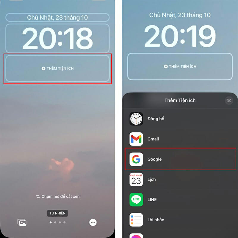 Bước 2: Kích chọn vào mục Thêm tiện ích > Tại danh sách các tiện ích người dùng hãy nhấn chọn vào Google để thêm widget này vào màn hình khóa.