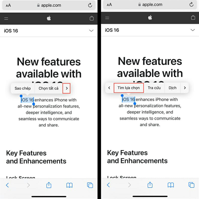 Bước 1: Người dùng truy cập vào ứng dụng Safari, sau đó hãy truy cập vào trang web người dùng cần tìm từ khoá. Tiếp theo hãy nhấn giữ “tô đen” từ khoá muốn tìm trong trang, kế tiếp người dùng nhấn vào dấu mũi tên menu lựa chọn, và sau đó nhấn chọn vào Tìm lựa chọn.