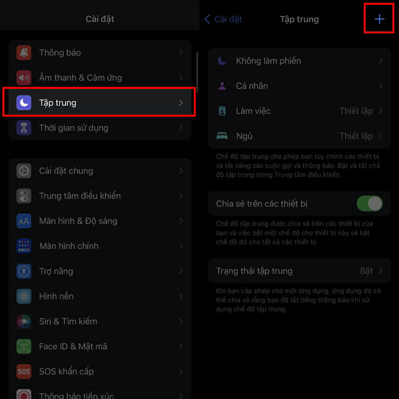 Bước 1: Đầu tiên người dùng mở điện thoại lên và truy cập vào Cài đặt trên máy. Chọn tiếp vào mục Tập trung > ấn dấu + ở góc trên bên phải màn hình và sau đó đến ngay với bước tiếp theo.