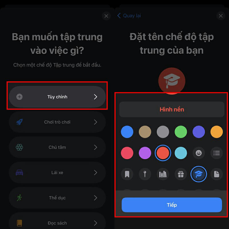 Bước 2: Tại đây người dùng hãy chọn tiếp vào Tùy chỉnh và tạo chế độ tập trung mới để tránh ảnh hưởng đến những chế độ tập trung của mình đã cài đặt trước. Tiếp theo, điều chỉnh các thông tin của chế độ như tên, hình nền, logo,…, khi hoàn thành thì người dùng hãy ấn vào Tiếp.