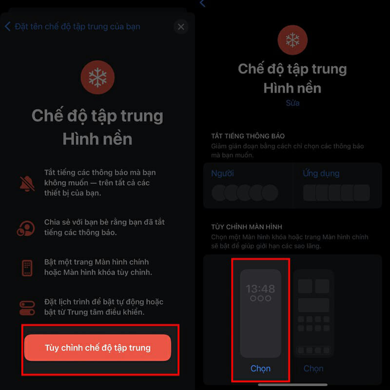 Bước 3: Đọc các thông tin của chế độ tập trung trên thiết bị rồi ấn vào mục Tùy chỉnh chế độ tập trung để tiếp tục. Người dùng sẽ thấy các tùy chỉnh của chế độ tập trung vừa tạo, hãy để ý đến mục Tùy chỉnh màn hình. Bấm ngay vào Chọn phía bên dưới biểu tượng màn hình khóa như hình bên dưới đây.