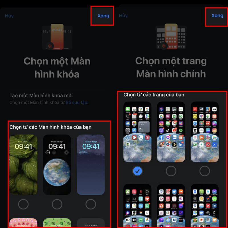 Bước 4: Tiếp theo chọn màn hình khóa mà người dùng muốn đặt cho khung giờ đó, sau đó chọn được màn hình khóa ưng ý thì hãy ấn vào Xong. Tiếp theo làm tương tự với trang màn hình chính.
