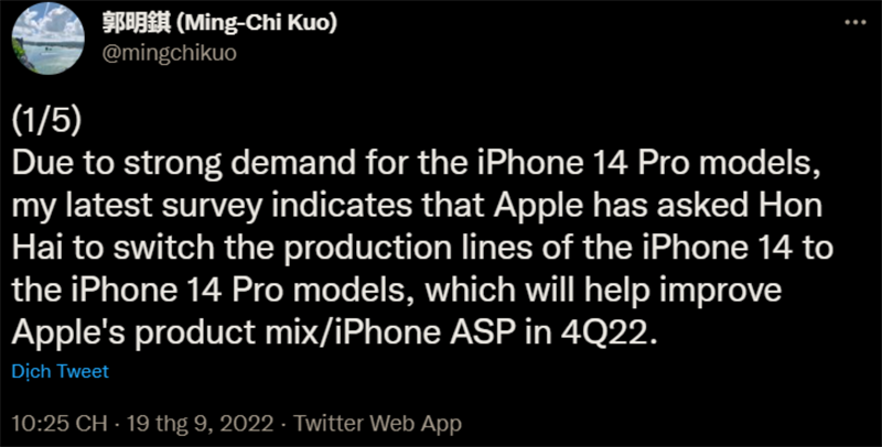 Mới đây nhà phân tích Ming-Chi Kuo đã tiết lộ rằng Apple đã yêu cầu Foxconn tập trung vào sản xuất iPhone 14 Pro Series, tức là các nhà máy sẽ láp ráp ít mẫu iPhone 14 hơn. Trong khi đó, trang DigiTimes lại nói rằng các bên sản xuất linh kiện cho Apple không hề nhận được tin tức nào liên quan tới việc này, tuy nhiên họ cũng được yêu cầu thay đổi tỷ lệ xuất ra thành phẩm với 4 thiết bị iPhone.