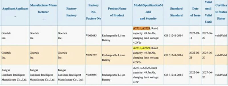Theo như danh sách 3C, AirPods Pro 2 có pin 49,7mAh. số model A2731 và A2729 là số model của pin TWS. Số kiểu máy của pin trong hộp sạc chính là A2798, theo như trang web về chứng nhận 3C. Đây chính là mức tăng 15% so với dung lượng 43.24mAh của mẫu AirPods Pro thế hệ đầu tiên.