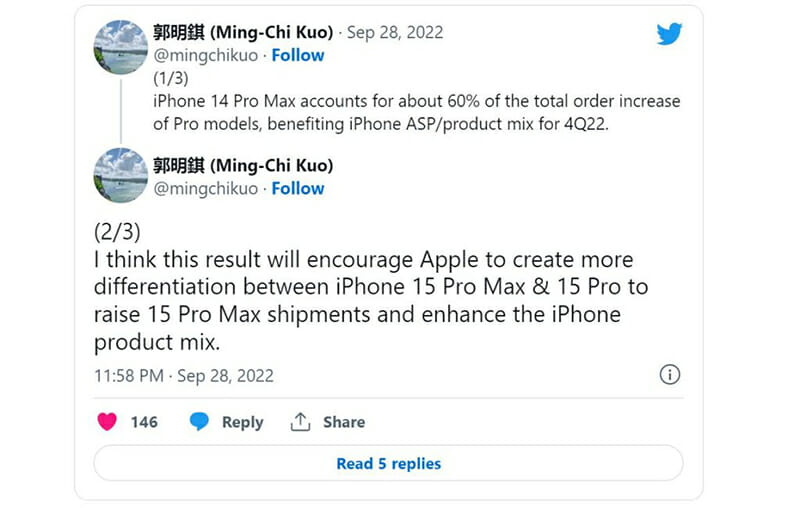Theo nhà phân tích nổi tiếng Ming-Chi Kuo, Apple đã nhận thấy nhu cầu cao đối với mẫu iPhone 14 Pro Max 6,7 inch, điều này có thể là cách công ty định vị iPhone 15 Pro và iPhone 15 Pro Max thế hệ tiếp theo. Apple có thể bổ sung những tính năng độc quyền cho ‌mẫu Ultra trong nỗ lực khuyến khích nhiều người dùng mua thiết bị lớn hơn và đắt tiền hơn.