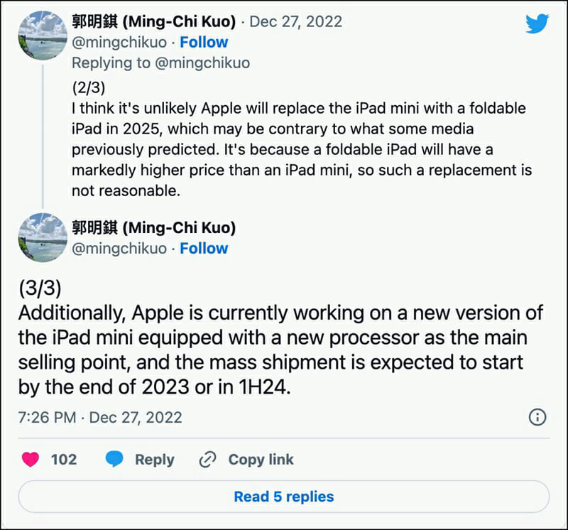 Nhà phân tích Ming-Chi Kuo không chia sẻ thêm thông tin chi tiết về chiếc iPad mini mới, tuy nhiên nguồn tin nói rằng Apple khó có thể thay thế iPad mini bằng iPad gập ít nhất cho tớinăm 2025, vì Kuo tin rằng mẫu iPad gập sẽ có mức giá cao hơn rõ rệt so với iPad mini.