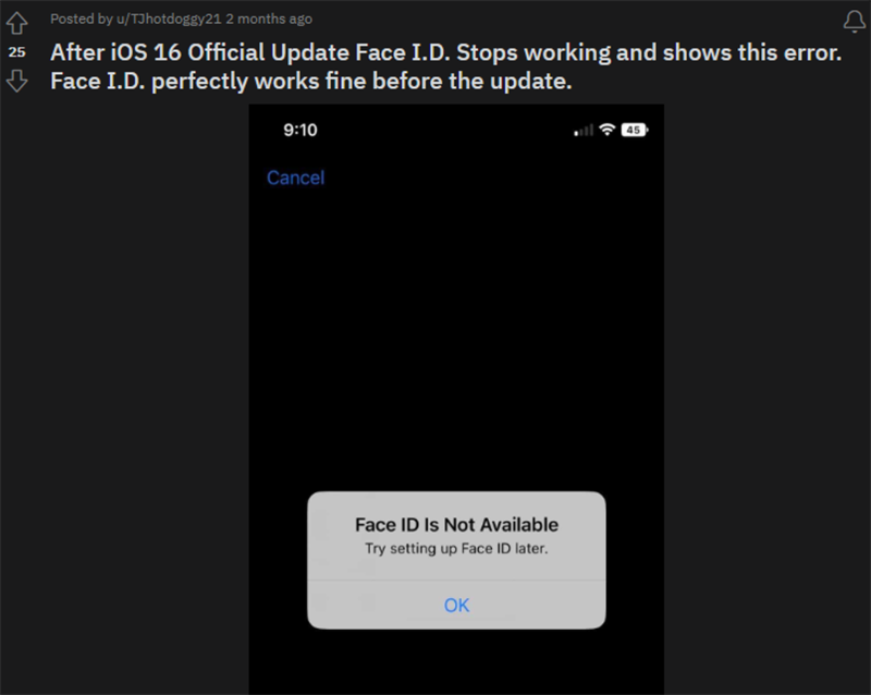 Trên diễn đàn cộng đồng của Apple, một khách hàng cũng cho biết nâng cấp lên bản iOS 16.1 khiến cho Face ID của họ không dùng được, khởi động lại thiết bị cũng không thể giải quyết được vấn đề này.