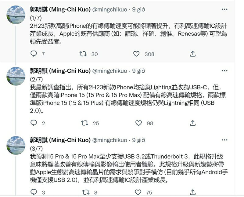 Nhà phân tích nổi tiếng Ming-Chi Kuo từ lâu đã nói rằng iPhone năm 2023 sẽ áp dụng cổng USB-C. Vào tháng 5, nhà phân tích đã suy đoán rằng sự thay đổi về cổng dữ liệu “có thể cải thiện tốc độ truyền và sạc của iPhone”. Kể từ khi EU bắt buộc các smartphone mới phải sử dụng USB-C đến mùa thu năm 2024, Apple đã phải miễn cưỡng thay đổi.